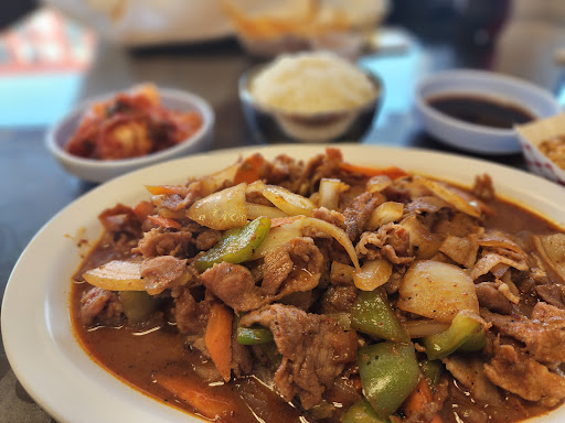 So far, the best bowl of bim-bam-bop in town. quite store front, easy parking, no wait, friendly and helpful staff. The price is competitive, and it comes with a decent portion of kim-chi as well as mild egg-drop soup. The beef is tasty, the cucumbers are marinated with vinegar and a touch of sugar (Chinese-like), and theres also savory potato shavings. Good portion overall.