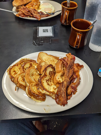 Server Was nice. Refill came fast Menu said only one refill on pop( Coke/Pepsi) I was disappointed to see a limited on Fountain drinks, but with that being said, I was offered a second refill so idk. Cheese burger 1/3lb was bland and lack taste. Fries where unfortunately frozen and not fresh cut. With that being said it was a cool place with nice people. The food was perfect for someone who was up all night partying. Kinda on the level of a Waffle house/omelet shop. meal was under $10 making this a far and Affordable Place to eat especially considering the area, and price point of the food serve around this area.