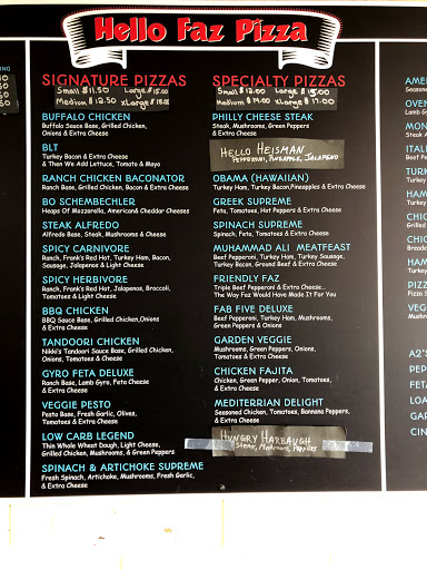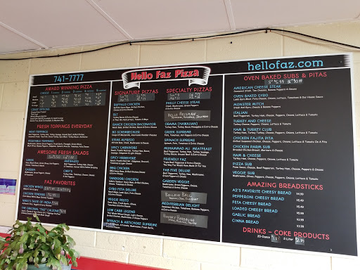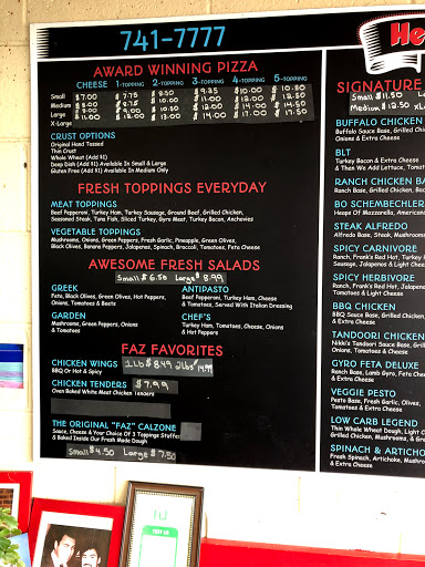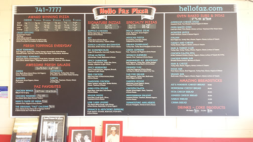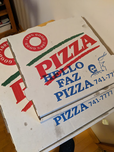 Hello Faz Pizza is my favorite place to get pizza in town. Those Faz has passed away, his spirit lives on in the place. The prices are still very good, and the staff is friendly as always. The pizza tastes great too! Its not quite as good as cottage inn, but youre paying about half the price. They are consistent too, only once out of the 30+ times I have been there have we had slightly burned pizza. The hours are great too, me and my friends come often after midnight. I hope Hello Faz stays there as long as it can, while Faz has moved on, I havent!