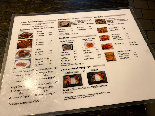 This is an updated review. I originally gave two-stars for the lack of cleanliness and terrible service. Because it is so close to our home, my partner really wanted to try out the restaurant again, so we did. Food is still good. The chicken is probably the best item on the menu. I tried the kimchi-jun which was originally mushy, but after trying it again it has improved, wings were great, tofu tacos (so-so), drum sticks, kimchi, pickled radish, and mandoo (I did like these although I got the meat mandoo when I ordered the veggie). Im Korean so I am very familiar with this type of food/establishment. Get a sauce with the chicken or it will taste bland. Surprisingly, since a couple weeks within writing the review, the restaurant seemed much cleaner. Cleanliness can be improved further and customer service was still not the best, but better than previous experiences. The Korean dude needs to lighten up. Overall, I do recommend getting the fried chicken with the soy sauce glaze. With that said, its nice to have a restaurant reminiscent of those chicken take-out places back in the motherland. Still cant beat the ones in Korea.