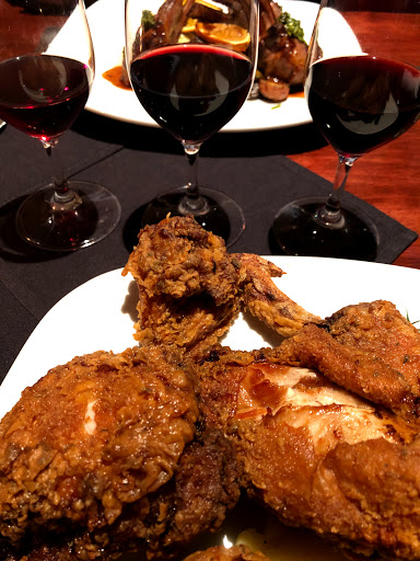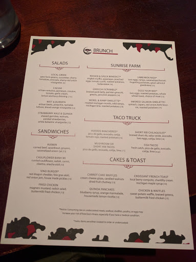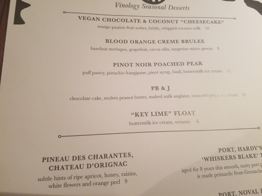 Vinology strives to be a foodie destination but like most similar restaurants in the Ann Arbor area, doesnt quite deliver. The New American menu is inventive & changes frequently. I had the Kentucky Fried Bunny in the lead up to Easter, which was cute, and also the best dish we tried that night. The wedge salad appeared on the menu after a Top Chef episode aired featuring a challenge make a dish with iceberg lettuce, but Vinologys take failed to excite. The dishes were more imaginative than flavorful; most were strongly over-seasoned. One of 3 scallops was sandy. When we brought it up, management apologized, citing a busy kitchen, and comped it. Service was friendly but not proactive; I had to ask for new flatwear and plates.