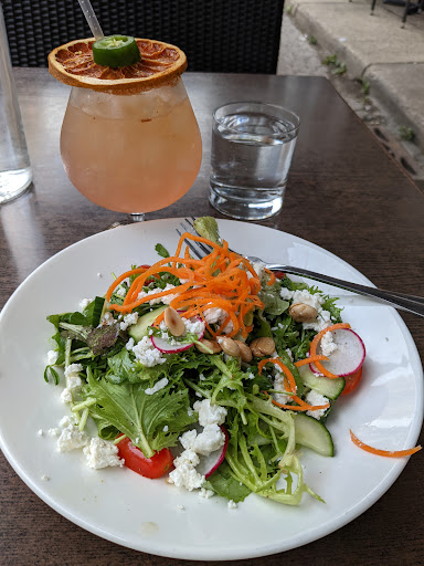 I sat outside, so I can not speak to the atmosphere. But, my appetizer, a Gorgonzola and fig flatbread, featured arugula, and the same store bought dried cherries youd find in the baking section piled onto a burnt crust. Im not knocking the quality of ingredients, its just these specific ingredients didnt balance well. The original cocktail I ordered tasted like watered down whiskey and bitter fruit. It was garnished with blackberries, which were themselves ineditible. Disappointing considering the place was highly recommended. Not worth a second try given the great experiences Ive had at nearby restaurants. The one upside was the service.
