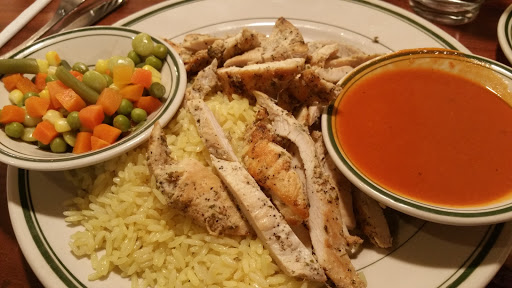 I ordered the Grilled Chicken over Rice entrée. Nearly half the chicken pieces were inedible, with a rubber-like consistency. The "Red sauce" that came with it didnt have much flavor; it tasted like it was straight from a can. The steamed vegetables were definitely of the pre-chopped frozen bag variety. The lemon rice soup and rice were decent. I realized (after leaving) that I wasnt served the greek bread that should have come with the entrée. Pros: server was nice, restaurant was clean, and I got my food quickly (this was approximately 1:30pm on a Friday) Due to my experience I dont plan on returning to Red Olive, nor will I recommend the chain to anyone.