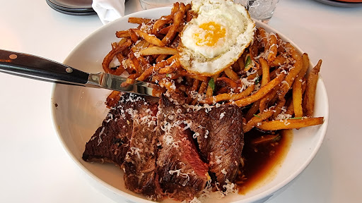 Tries very hard to be "edgy", but everything is not cohesive enough to come across genuinely. Dont get me wrong, food is okay, not great, but okay. Fries have a huge portion and are pretty good. The other items we got were fairly overpriced for what you get. The menu options are a strange combination of American and Mediterranean. Overall, wouldnt recommend.
