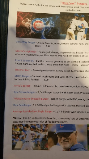 Good food, great hometown Cubbies hangout. If the cubs win, they get down. We try to go there weekly. Fish on Fridays or burgers Tuesday.