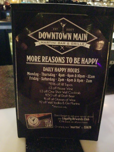 1st off, I have to admit I am a bit biased as I am friends with Lindsay, and have just never gotten a chance to eat here before. Also, because I do know her, I had very high expectations, and they were certainly met! I went with 2 friends for a moms night out. It was a Friday evening and we were seated right away. I did notice a faint cigar smoke smell from the cigar lounge downstairs. But it is a sweet, earthy, wood smoke smell, not at all off putting like cigarettes. After about 10 minutes I didnt even notice it. The atmosphere is really nice, with a cool lit up bar, comfy leather couches and dining tables. It is a bit loud in there as there is nothing dividing up the dining/bar spaces. We each ordered martinis, everyone was happy with their drinks. I got the Mango Madness, and it was awesome, still want more! Super rich mango flavor! I ordered their Steak Diane for my entrée. The steak was beautiful, tender and cooked perfectly! (I am SUPER picky about this, as I like my steak r-a-r-e, and hardly ever get it like I want it. A nice hard sear on the outside and raw in the middle.) The cognac mushroom steak sauce was perfection! If I hadnt been out at a restaurant I seriously would have licked the plate, it was that good! The redskin mashed potatoes were a little dry, but seasoned nicely and were great with the Diane sauce. The asparagus was cooked a perfect al dente. I got a second martini, this time the Berry Drop - also very yummy! I would definitely recommend Downtown Main to friends and family! It is not a family place, but perfect for a date night with your special someone, or a night out with friends! Thank you Lindsay, I will be back for more!!