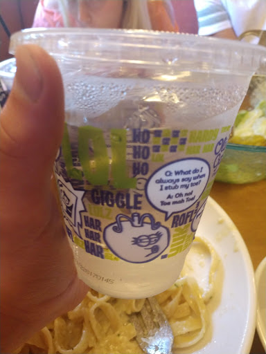 Angel hair pasta way, way overcooked. Canned olive in a restaurant named olive garden. Should be calamata.