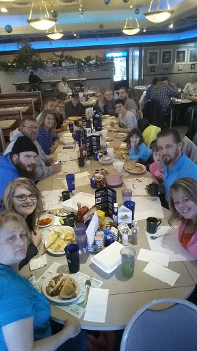 Large comfy family restaurant with diverse menu of bkfst/lunch/supper food choices. And yummy round rasin bread toast! Good and attentive server with a sense of humor.