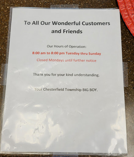 It was very clean and newly remodeled. But the wait staff were to be desired for, no one wanted us seated in their area for one. Then they tried to stick us all the way in the very back at a table. We had our small son with us, so we asked for a booth, which there were more than plenty empty booths, because it makes it easier to contain our boy. We got an attitude when we asked. Our food was cold, missing items that came with our combos. Then waitress came by once to see how we were and left the bill never came back again and we were not even close to being done eating. I was going to order dessert for all of us as well. But lost that sale. On our way out no one said by, thanks for coming to big boys, come again. They were all to busy talking rather loudly about their personal lifes and activities. Very poor customer service! My bill was 39.89, it would have been higher if I was able to older dessert. Even after all that, I left a five dollar tip. Just think of what I would have left if the service and food would have been better! Just a thought before you waste your money On a night out from cooking, cause if I wanted all that I could have stayed home.
