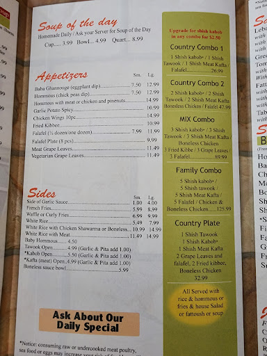 This is by far the BEST Middle-Eastern resturant in Dearbron, and I have been everywhere. Their protions are very generous. Their hommus is one of the best ive had. Tabbuli is delicious. The owners are very friendly and personable. Anytime we have guest we bring them here and they are blown away with how delicious and fresh (especially the Falafah hard to find freshly home-made falafah now a days) the food is and its reasonably priced. GREAT JOB country chicken!! I do want to add my husband is Yemeni and we are always greeted and treated very kindly and the owner knows us by a first name basis. I read a review that said they were prejudice towards yemenis, that is very upsetting if this is how you treated. I cant speak for the cook or any of the other workers, but I am for sure its not the owners and they would not tolerate such ignorance. I will be sure to let them know about that incident on my next visit.
