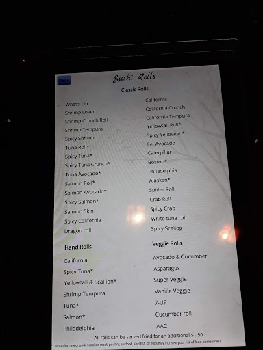 Amazing Variety. So many unique options that Ive never seen before. We had Tokyo Drift (Fresh tuna, cream cheese, jalapeno & avocado rolled & fried then drizzled with our house sauce), a BANANA ROLL (Banana tempura, sweet potato tempura, cream cheese, rolled with soy paper and drizzled with our secret sweet sauce) and MEXICAN ROLL (Spicy tuna, jalapeno, cilantro, avocado rolled & fried then topped with spicy crab, scallions, jalapeno, spicy mayo & tapatio sauce). We used the banana roll as a desert. It was all great. I totally recommend the place because of its variety.