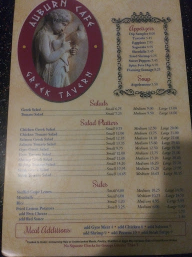 Ive been to the Auburn Cafe about 200 times and never had a bad meal. The Chicken Greek is my favorite lunch with super fresh vegetables and their signature Greek dressing. Gus, Josey, and the whole staff treat me and my guests like family. Try the "Auburn " Im quite sure youll agree its awesome