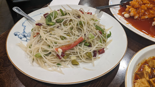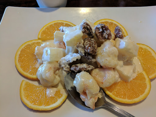 Remodeled interior: Very impressive. Service: Very good. Cantonese Crispy Almond Chicken: Very large portion. Nicely prepared, very crispy. Gravy odd and flavorless. Egg Roll: Over cooked wrapper but served luke warm. Too common practice of partial cooking earlier in day and short dip in fryer at time of serving resulting in substandard product, IMO. Hot and Sour Soup: Luke warm and flavorless. No hot, no sour, no flavor. Shrimp Fried Rice: Lots of shrimp, little flavor.