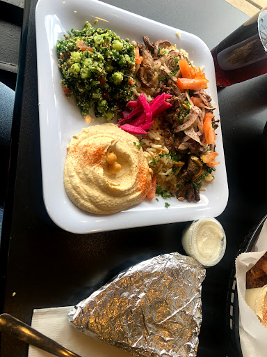 This fast service, Chipotle like, Middle Eastern resurant is delicious. I tried both the chicken shawarma and the falafel. The falafel has a crispy exterior and a warm fluffy filling. The chicken shawarma is moist and well seasoned. The house made toum (garlic sauce) is awesome. My 1 complaint was that the side order of tabouli was a bit dry, but I was mixing it with the hummus and it tasted great. Will be back.
