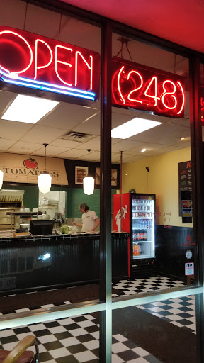 Do you like Pizza loaded with fresh ingredients end to end with a delicious chewy and crispy thin crust, slightly burnt on the edges? I dont like it, I LOVE IT! OK then, get to the Tomatoes Apizza buffet M-F before noon, it gets crowded. Tomatoes can handle it. The Salad bar is stocked. There is also pasta, soft drinks and a piadina for desert... thats a nutella like deliciously filled dough-ey desert (if you can save room!) ...but lets talk more about the main course... the Apizza. I can not say enough about it. I am getting hungry thinking about it. You must try it to believe it. Do yourself a favor, come with an open mind and an appetite. And the buffet, what a steal! It only like 8 bucks!? Bring a friend. Sit with a view of the brick arched window, where the cooks are putting out a variety of super hot pies. You wont believe the variety either. Something for every pizza lover to be sure. My favorites are: pepperoni, sausage, bacon, anchovy, hot peppers, krab... they also have a variety of veggies, and sauces besides the classic red. Dont see what you like? Ask them to make it, they will. Tomatoes is open late, they deliver, and they rock! Pizza and Salad bar = Awesome! Buffet Price=unbelievably low! Service= Impeccable! Well done Tomatoes, well done. Its in my rotation for sure. The pride of Farmington Hills. They do have another location, Ive never been there, I hear its just as good.
