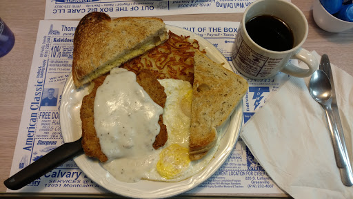 What a joke! First time going there will definitely be my last. Ordered some breakfast and a Coke. Took them about 10 minutes before they came and took my drink order and then served it to me in a glass that looked like it had been chewed on. Took another 15 minutes after that to take my order. Which was an order of corn beef has one egg and toast. 20 minutes after that my order arrived. I would understand if they were busy but there was like 5 people in the entire restaurant. They charge me $2.50 for the soda in the chewed up glass. The Corned Beef was out of a can of course. And it seemed to me like a straight knockoff off of classic Kellys out of Cedar Springs the menus were almost identical. Which should have told me to get out of there as fast as possible! Both restaurants are horrible with overpriced sub-par food at best. Why so many elderly people waste their money at those restaurants is beyond me. Maybe when you get that age your taste buds and decision-making skills arent that great.