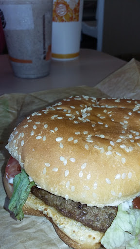 The food is always hot and tasty, for Burger King. The staff is terse and often outright rude. Theyve never said "please"or "thank you" to me. The wait is very long for fast-food. My average time between ordering and getting the food is about 5 minutes. On one occasion, I waited 12 minutes for my burger. The only reason I eat here is because its the only place near my workplace that sells vegetarian items.