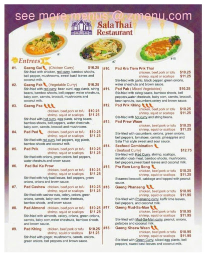 I look forward to Friday evenings when I order my favorite, Chicken Pad Prik from Sala Thai. I order it "extra hot". It has a good amount of heat, but not "burn your face off hot". Great flavor. Everything tastes fresh. Great rice, I love the Brown Sauce. The portions are large. I can get Dinner and 2 Lunches from the Dinner portion. The prices are about par for what you get. My Daughter always orders Sushi. Being a Vegetarian she eats a lot of Sushi and says theirs is very good. She enjoys the Bagel Rolls. I travel for a living and eat Thai food all over the country, but Sala Thai is still my favorite.