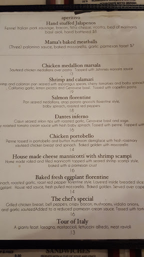 My wife and i went there yesterday, they lack service, one guy trying to service everything. Too busy to properly ask questions to or get orders right. Food was good, not excellent but would eat there again. This was my 2nd time there. Big portions. Took most of food home. Had the Artichoke, spinach & chive dip, which was awesome. Wife had "tour of Italy" good. I had chicken parm. with lasagna. it was ok. all in all, it was good but needs help. If your going to act like a somewhat higher class restaurant, dont have the help come in front door, or have the managers/owners have a table in the back set up like an office desk. Takes away from the reason your there, not listening to people answer phones and do there bills. Just needs some fine tuning, could be a very nice place.