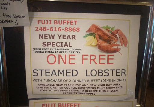 I have been going here for the past two or so years. Its a 40 minute drive from Grosse Pointe for me but It is the only Asian buffet that I will go to. The selection and quality of sushi and sashimi and far superior to any buffet Ive been to and the employees are constantly making rolls and putting out new plates. Probably the most underrated part of the buffet is the soup bar. I usually have duck or beef Vietnamese Pho and it has among the most intense and amazing flavors of any food Ive ever eaten anywhere. I only go on Fridays when they have their ginger lobster on the buffet. Its good but only half of the pieces are edible. The other half consists of snow crab knuckles which are for the most part inedible. The placement of hunks of crab cartilage in the lobster is not a fluke as it is served this way every time Ive been there. Snow crab knuckles are NOT lobster so they shouldnt be added to the lobster. Its obviously done to reduce lobster consumption but that is accomplished by servers rationing out the lobster on your plate by the spoonful. I would appreciate it if Fuji showed some integrity on this and left the crab knuckles out of the ginger lobster in the future. Fuji thinks its a neat little trick but in the end the restaurant comes across as dishonest. The service is usually very pleasant and the overall selection and quality of items, particularly fish and seafood is very good.