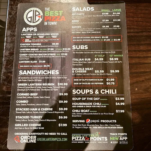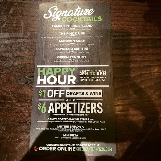Just moved to town from Texas (what was I thinking)... been here for 21 days, been there 3 times!! Great pizza! Very good salads, cheese bread and cold beer! The chicken wings were average. I also like how they have a fresh popcorn if you are just there to hang out and drink a few beers. the popcorn is free of charge. Everyday I think about the Green Lantern. Staff is good too.