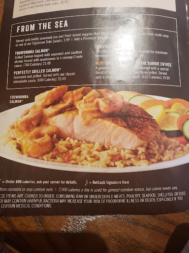 AVOID THIS LOCATION. Service has been good for me, but food is unacceptable. Ive given this location two chances, both were beyond disappointing. My medium-rare prime rib was at least well done and completely covered in pepper. My fiances sirloin, ordered medium, was shoe leather. It was also supposed to be an 8oz, but measured 3.5oz at home. I realize that it loses some weight in cooking, but usually 20%-30%, not more than 50%. We the out a $50 meal and ended up going to McDonalds. I highly recommend Outback, but NOT this one. Drive the extra distance to go to a different location.