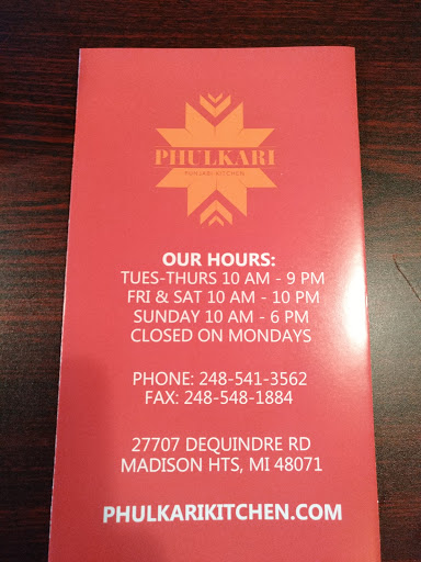 Food is good North Indian Punjabi food, but there are some issues with inconsistency, and not all menu items are consistently available. Specifically, they almost never have "makki roti & saag." And the last time I ordered it there, they forgot about the order, and when I mentioned it to them, they brought it burnt. I imagine they hurried too quickly when they realized their mistake. They often run out of specific ingredients over the course of the day; for example, a few weeks ago, I went in the evening and found that they used all the chana/chole, so no dishes containing chickpeas could be ordered. Best Lamb Biryani in Town! But, everything considered, it is one of the best Indian options in SE Michigan. The lamb biryani is especially good. Other restaurants in the area serve far inferior biryani by comparison. For example, Rangoli in Auburn Hills (which won best Indian several times in Hour Detroit) always serves biryani with tough meat. And Punjabi Sweets in Troy makes good biryani, but their lamb meat is bone-in chops, which makes eating it more troublesome. But Phulkaris lamb biryani is always tender, never has bones, and is consistently delicious, with properly-cooked rice.