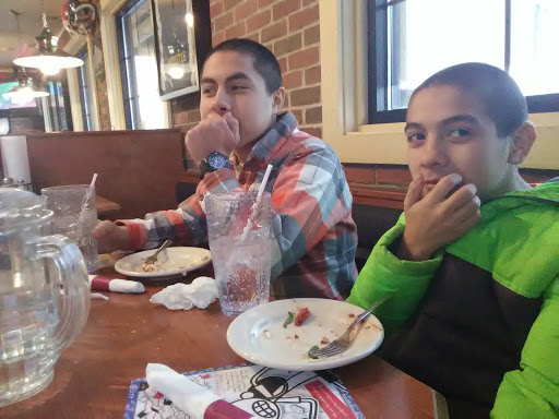 Server was friendly, crowded, pizza came fairly quick. But it wasnt hot, just warm! Didnt get our pop refills til the end in to go cups! Wish Id had the pop while eating. Server was working her butt off so I can understand forgetting our refills! Also kind of pricey!