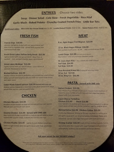 The Little Bar is a Marine City icon that suffered a fire a few years ago. It was closed for quite a spell. I just recently visited the Little Bar for a St. Patricks Day meal of corned beef and cabbage. Well, the meal was excellent with the service uncommon friendly and attentive. It was my first time there, but the staff treated me as if I were a long time regular. Living up to its name, the bar is rather short and the dinner area cozy and comfortably sized with large window views along the street front. The interior is neat, tasteful, well organized and squeaky clean. And, it does not have the aroma of stale beer that so many poorly kept bars often have. That is a big turn off for me. The menu is not overly large, but the selection caters to every taste,. As one should expect for a river town, the Little Bar has several fresh, lake fish dishes that I am dying to sample. They even have a sesame chicken dish that I certainly have my eye one. The cuts of corned beef, BTW, were generously thick, lean, and unusually tasty indicating a good buyer for the kitchen. Prices generally hover at $8.95 and $15.95 depending on the dish. Will I go back? You bet. Cant seem get that sesame chicken out of my head!
