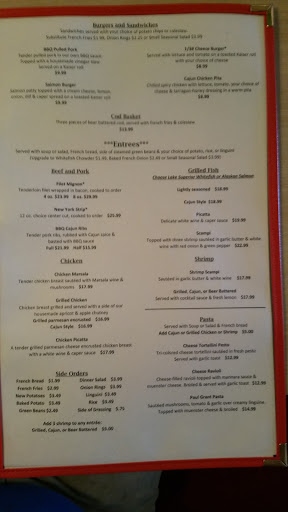 My girlfriend and I made reservations and had arrived early. I told the host I might go to Black Rocks to have a beer, he then asked which kind of beer I would get. He came out to the sidewalk bench where we waited with a full coffee mug of my preference. The breadsticks were a great starter. I had the filet mignon for the main course and it was cooked perfectly. The waitress was quick and seemed eager to keep us happy. The blueberry beers are a treat if you cherish a tasty brew.