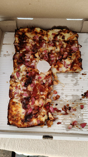 Very good square pizza. They have slices to go.