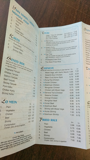 Pad Thai is excellent, as is the Thai basil fried rice. Havent tried the Chinese or Japanese menu, but the Thai stuff is on point. Great portion sizes for the price, too. Be warned, however that if you order the pad Thai lunch special it comes in a styrofoam container. Normally they put it in so hot that the notes touching the styrofoam melt it a little and take on the flavor of the foam. If you order the large portion it comes in a reusable container that is great.