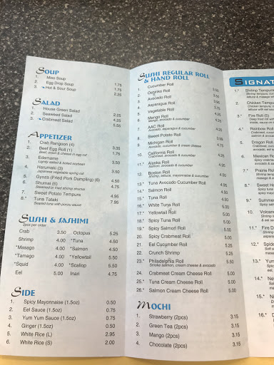 This place has a very large menu. They have a lot of dishes to choose from, but they have a lot more sushi than any thing else. This is a good place to go to for some very tasty miso soup and sushi preferably over the other dishes. They are very nice a day the prices are predictable for Asian cuisine.