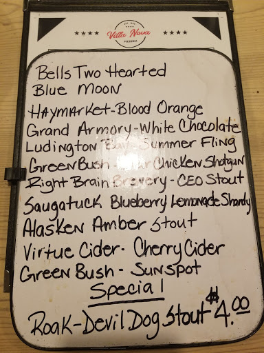 My wife and I have spent many weekends over the last 25 years in the New Buffalo area and have sampled several of the local pies. We recently ordered a large thin crust with canadian bacon, sausage and onions. The crust was exceptionally thin, crisp and perfectly baked. The toppings were abundant, fresh and flavorful. This was by far the best pizza weve found in West Michigan. We now refer to it as the Champagne of pizzas...making this restaurant the Champagne Villa Nova! It was nineteen dollars well spent!