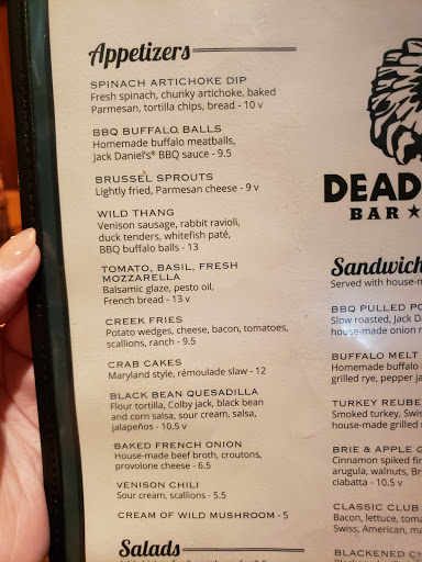Great Place! Our hiking club descended on the Deadwood, without but an hour notice. there were 22 of us! We dont normally have that many people, and we try to call ahead of time, but with just an hour notice, at noon lunch time and on a Sunday, they accommodated all of us with smiling faces! We all ate and drank and everyone was happy and pleased! My hats off too all of you at Deadwood Bar and Grill! Very impressive!