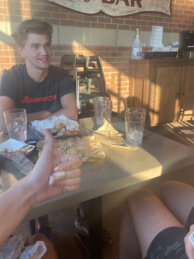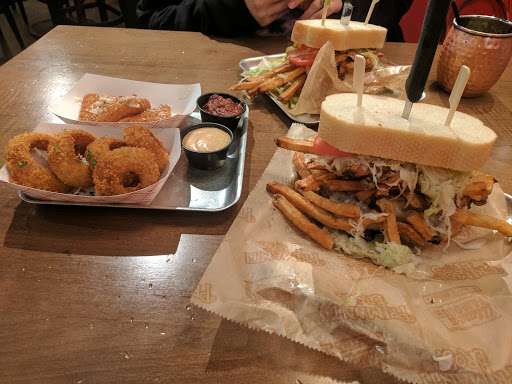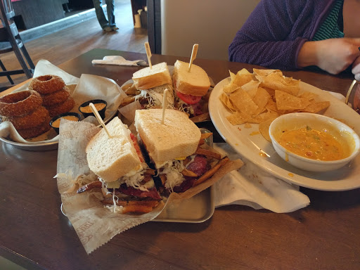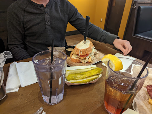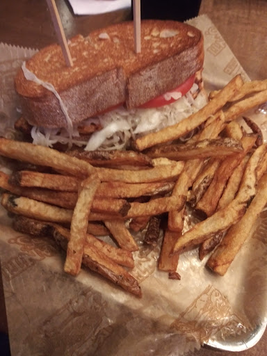 The atmosphere gets a 5 star rating. Good place to eat, watch sports & drink beer. The restaurant reminds me of Buffalo Wild Wings. They are known for their sandwiches, however; the menu offers other items such as pizza, burgers, wings, chicken sandwiches, fish, and salads too. Their sandwiches get a 3 to 4 star rating. They are huge! This isnt a problem, but it seemed to be lacking some mayo or something to tie it all together. The bread is soft. The meat is delicious. The slaw adds a nice crunchy sweet vinegar twist. You can fries on the sandwich or get them on the side. Either way they are yummy. I recommend you try them for yourself. Im willing to visit again.