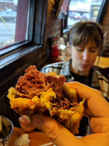 I dont see the wow factor of old tasting gray beef and unrecognizable greasy bread. And pickles that taste like plain cucumber. Not new dill even. Anyway. The food was Ok. Other meat like corned beef and other side items were a lot better. Maybe I just dont love the beef. I may try again. It just seemed like the B. Team was on instead of the A. Team. People were very nice though.