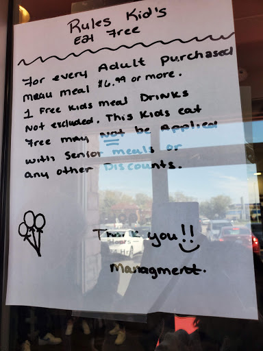 Great location and staff. Food was good and served quickly. My only problem was I had called ahead due to some questions I had about the kids eat free promotion. Was told that all children eat free period. Seeing how I have four children that was a selling point for me. Once we received the bill I quickly found out the its one free child meal for every adult mall (which is the norm). However if I would have known this ahead of time I would have went elsewhere!
