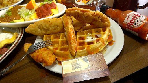 Waitress was very stand offish. Ordered a Mexican revolution and Belgian waffle. Waitress asked me a question using some local slang I didnt understand. I asked her what she meant 3 times and she just repeated herself to me until I said I am not from around here. Food arrived quickly but I had to flag down a waitress multiple times until I got a drink refill. The Belgian waffle was large like one but not crispy, tasted like it was made from pancake batter from a box. Instead of being crispy it was soft like a pancake. The Mexican revolution looked nothing like the picture and looked unappetizing. Tasted mediocre at best. Will not repeat.