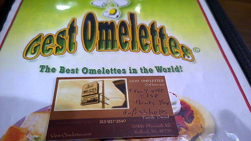 Went to Gest this morning, Redfordfor a Popeye Omelet w/grilled chicken. First off it only contained approx, 6 small pieces of chicken breast & a heap of spinach. Then to top.it off, my omelet was so dark, I agree with the customer who said their omelets looked like 2 fries taco shells. This place has went down in reference to quality since the last time that I had been there. I use to recommend this establishment, but never again. Today will be my last visit. Thank you, but NO THANK YOU GEST OMELET.