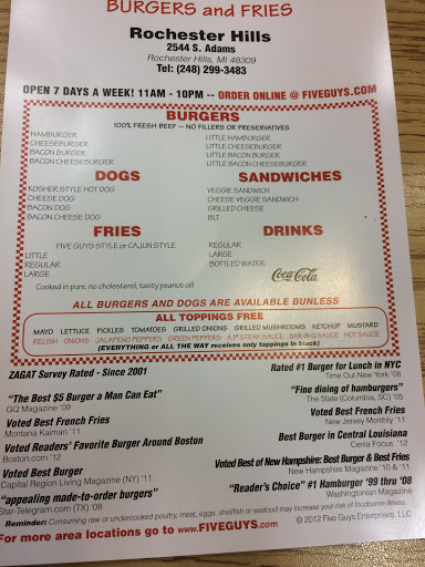 Five guys is always good and this location is no different. Everything was huge and delicious.