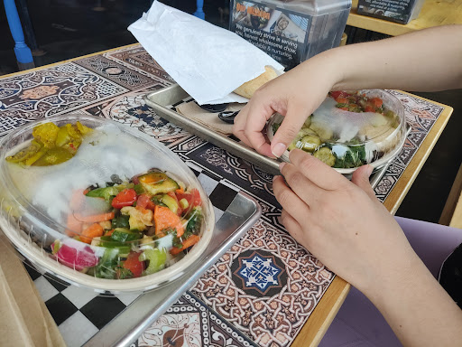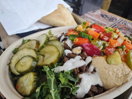Ive noticed people commenting (at least on Yelp) about the portion sizes -- and Im actually surprised. Im consistently left basically force-feeding myself the last few bites because its delicious and I cant bring myself to leave any behind. The food has been great every time, but Ill be honest, I stick to the same few things. Ive gotten the chicken every time, but last time I went I was happy to discover you can get half and half for protein, so I did chicken and falafel. You get two falafel with a half portion, so Im not sure if four is considered a full serving or if they round up to five, but they are decently big. I dont typically like falafel but I like eating vegetarian when I can, and Ill definitely be ordering it again. Theyre crispy and delicious, and fried to order so they dont sit around and become soggy. Because theyre the same concept, Ill make the comparison to Chipotle. I get the Honest Bowl, which costs more than a bowl from Chipotle at $11.50, but I normally leave Chipotle feeling like I could eat more. The giant piece of Samoon bread that comes with the Honest Bowl could make up the price difference alone -- but you also get more food in general. The humus is smooth and flavorful, and I highly recommend the spicy harissa sauce -- but from what Ive tasted, you cant really go wrong with anything here.