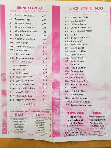 The absolute worse Chinese food I have ever had! Taste like a horrible frozen dinner. the eggrolls were NOT eggrolls, they were made with some sort of cabbage. NO taste! everything was horrible. I threw out the entire dinner after tasting two bites of everything. I will NEVER go back, Mayflower or Bok ho are the best Chinese places to go to