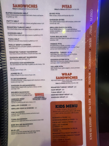 Worst food Ive ever eaten! The wait staff offered to take it back and have it re-made or get a new order, however it was clear that the cooking wouldnt improve. The menu was busy with the attempt at misleading thier customers into believing that the Village Grill is something more than a cut-rate greasey spoon. You would get better quality and value from a fast food chain.
