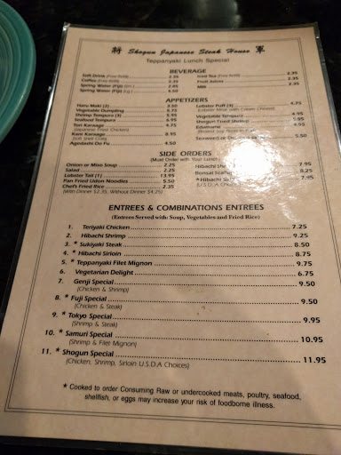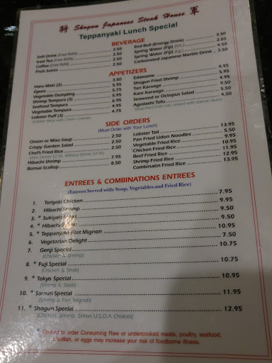 Been going to shoguns for years, I really am disappointed to say what a terrible experience I just had here. The wait staff shoved us into a corner of a larage party. Now they normally fill the tables but I was sitting behind the food next to another station. Less then a minute into looking at the menu she comes back for our order like we were holding up this table that already finished their soup and salad. I also want to mention they were dead, so it wasnt due to the need to keep a steady pace. The most important part to me that makes me never want to come back is the actual chief. As Ive mentioned Ive been going to this location for years, but the chief today I had never seen before. He was young and clearly inexperienced, someone at the table wanted their meal cooked workout butter, so instead of making it separately he cooked it all without butter then after serving her hed add the butter to the cooked food. It all had 0 taste, which after watching him prep the meats I realized he just didnt add any seasoning... he just threw meat down, poured oil and called it a day. Im sorry I got lengthy but Shogun, lets get real. Your prices have gone up every year. Spending nearly $50 on two meals Id hope I could actually enjoy it.