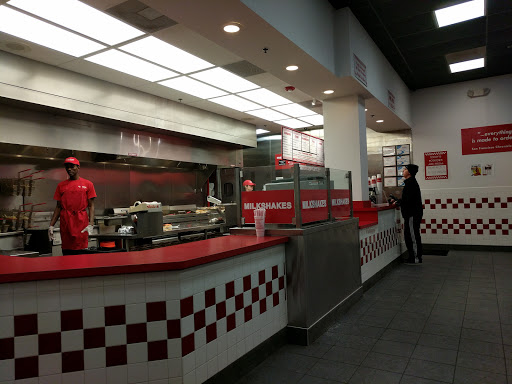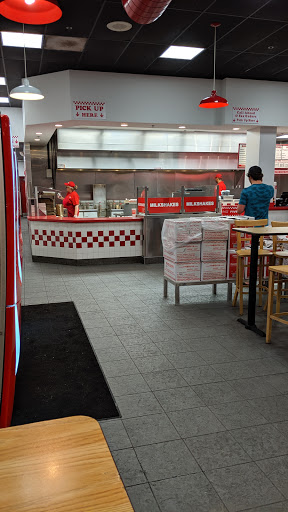 Typical Five Guys. Great food and options for your burger or dog. Fries are a must, but the sizes are huge, so a "Little" fry order is more than enough for one person, even the extra hungry of us. It gets pretty busy at lunch time with little room to wait, but there is ample seating area if you want to dine in.