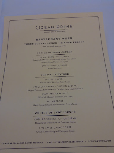 My husband and I were in town for a concert and decided to dine at Ocean Prime. Our favorite prime seafood restaurant is Eddie Vs in Scottsdale but the one in MI got mixed reviews so we came to Ocean Prime instead. The decor and service was impeccable. The bread mediocre. The ceasar salad was bland even with anchovies added - $10. The dinner was good but way overpriced in my opinion. I had the salmon special which was $56 a la carte (waiter failed to mention the price of the dinner special and I failed to ask but really wasnt expecting a piece of salmon to be over $50). My husband was torn between the crab cakes and scallops so they did a combo - 2 scallops and 1 crab cake with risotto - $37. Cappuccino was OK but not for $5.50. The butter cake with ice cream and fruit was nice but not worth $13. Smoked Gouda tater tots - good but mushy texture (likely due to the cheese and maybe being undercooked - $11. In the end, we spent $132.50 for one salad, 2 entrees, 1 side, 1 cappuccino, and 1 desert. For me, the food was no where near as good as the price we paid for it. Disappointed unfortunately.