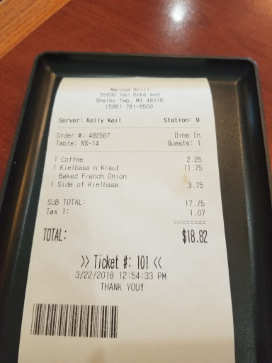 The food and pricing is great. However the service is very poor. This is the second time that we have had dinner at Marcus Grill. Either the servers are poorly trained or they hate their job. We have had better service at fast food restaurants. Tonights server was Kelly. Not be personal. However she dose not care about her job. In fact, I think she hates that she is a server. She would be better as a race car driver. She rushed threw the soups and the complete dinning process. Now I know she know what the soups of the day are. In fact, she might have said what the soups of the day are for the last 6 hours of her shift. Who cares. Its not about her. Its about us. Now dont think that I am picking on her. This is the same service that we received just a week ago. Either the servers have not been trained correctly Or they hate what they do. They rush threw each step of the dinning process. If you hate what you do "find another job". If its management not training - Then - management better get training done. Why? Well, the great food and pricing will not keep Us coming back. Then the servers wont have to rush. No body will be there to rush them. Service is the worse that I have ever had in my life time. (59 years.) Good luck.