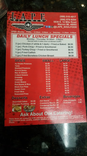 Great Food, staff is welcoming and you can tell they cook from the SOuL, and lastly their restaurant is clean which is a plus in My book. Keep it up LAPE!!