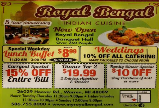 Their food is delicious. We have driven to the other side of town for Indian food and this is just as good as the highest rated places. Tandoori is excellent, tikka excellent, give ample rice, ask for the sauces. Naan is lovely. Large portions, cheap for Indian. Breaks my heart to see it with few customers in the evening. All I can say is go! Lovely people that run this restaurant. If you are a beginner get Chicken Tikka Masala and Mutter Paneer, and Naan bread to sop up the sauce. Mmmmm. This is a creamy chicken and peas with cheese. Indian can be very spicy so go light on the spice at first unless you like heat, then go spicy. I have not been to the lunch buffet but it looks great. I-696 AND GET OFF AT HOOVER. HEAD SOUTH TO THE KROGER PLAZA ON RIGHT. The plaza isnt much to look at but this gem is there!